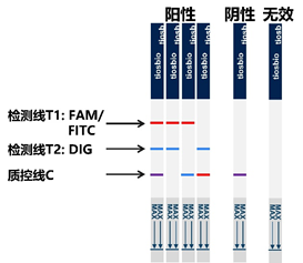 試紙條質(zhì)控線(C線)和其中1條檢測線(T線)出現(xiàn)條帶,其中:T1為紅色,C線為藍色時,說明FAM標(biāo)記信號分子的相應(yīng)靶基因可判定為陽性;T2為藍色,C線為紅色時,說明Dig標(biāo)記分子的相應(yīng)的靶基因可判定為陽性。