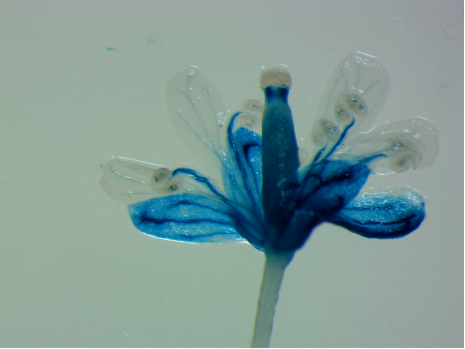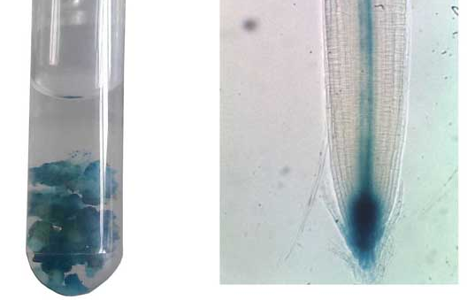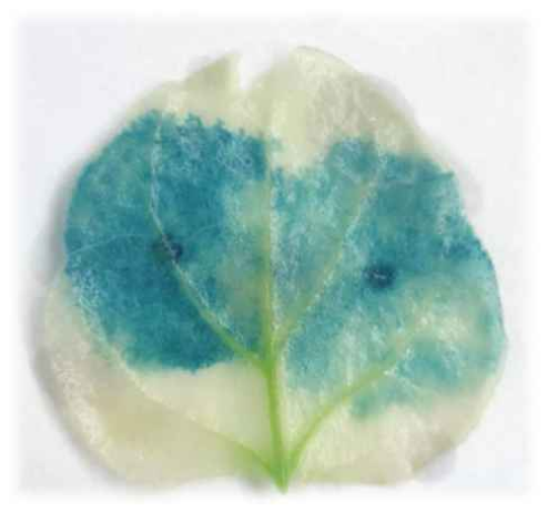 4.觀察:一般染色后,GUS染色陽性的藍色斑點肉眼就能看到。但是有些材料可能藍色斑點很細微,要在顯微鏡下才能看到。