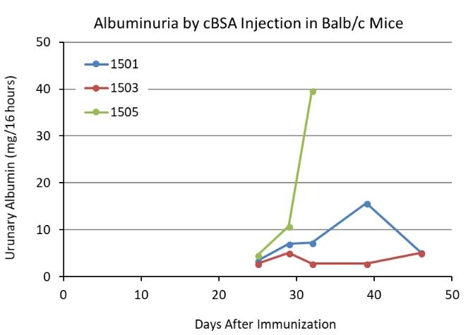 Chondrex公司提供陽離子牛血清白蛋白(cBSA)和完全弗氏佐劑用于誘導(dǎo)小鼠免疫復(fù)合物腎小球腎炎(IGGN)。同時提供小鼠白蛋白檢測試劑盒用于評估免疫復(fù)合物腎小球腎炎發(fā)展進程。具體造模流程參照“小鼠免疫復(fù)合物腎小球腎炎造模方案”。