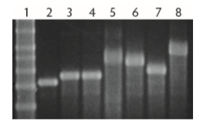 圖1.定制的Poly(A)尾部長度。 使用各種反應條件將1.4-kb的轉(zhuǎn)錄本進行聚(A)尾部修飾,以證明其對聚(A)尾部長度的影響。 每個泳道包含0.1μg完整的poly(A)尾反應產(chǎn)物。