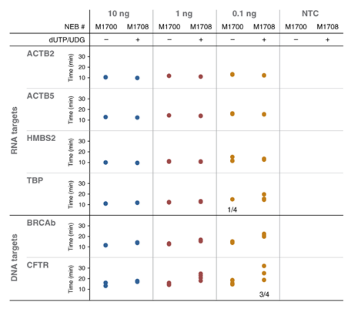 使用 WarmStart 熒光 LAMP/RT-LAMP 2X 預(yù)混液(不含 dUTP/UDG)(NEB #M1700 試劑盒中的組分)和 WarmStart 通用 LAMP/RT-LAMP 2X 預(yù)混液(含 UDG)(NEB #M1708)進(jìn)行 RT-LAMP(RNA 靶標(biāo))或 LAMP(DNA 靶標(biāo))實驗。反應(yīng)加入 1X LAMP 引物和 1X LAMP 熒光染料后,分別加入三個數(shù)量級的 Jurkat RNA 或 Jurkat DNA (10 ng-0.1 ng)和無模板對照(NTC),每個樣品做 4 個重復(fù),形成 25 μl 反應(yīng)體系,置于 96 孔板中 65℃孵育 40 分鐘。使用實時熱循環(huán)儀(Bio-Rad? CFX96)中的 SYBR/FAM 通道進(jìn)行 15 秒一次的熒光檢測。每個點代表熒光信號超過儀器閾值的時間。除了個別說明外,每個樣品都檢測到所有 4 個重復(fù)(注:如果各重復(fù)的檢測時間相似,則檢測點重疊)??傮w而言,各樣品檢測結(jié)果顯示:NEB #M1700 和 NEB #M1708 性能一致。無模板對照均無擴(kuò)增。