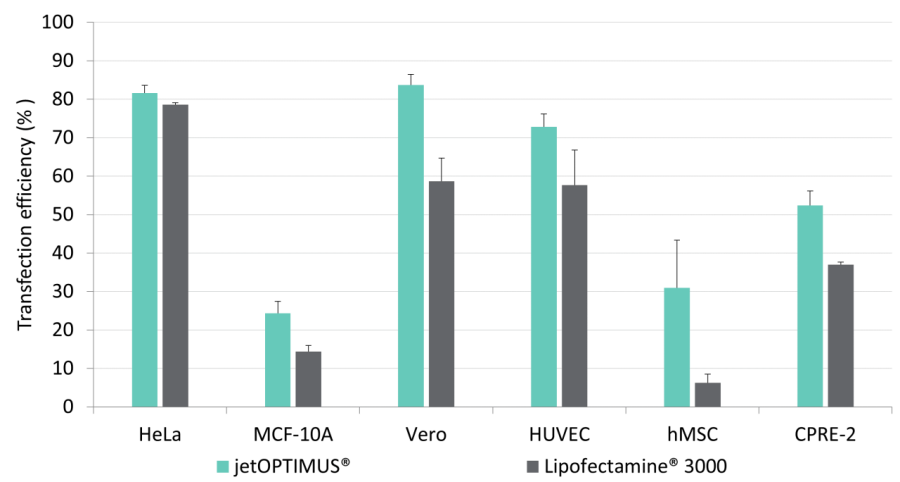 圖1: jetOPTIMUS?勝過其主要競爭對手。在24孔板中用編碼GFP蛋白的質(zhì)粒轉(zhuǎn)染后24小時,通過FACS分析在各種細胞系中評估轉(zhuǎn)染效率。根據(jù)制造商的建議為Lipofectamine?3000和jetOPTIMUS?.