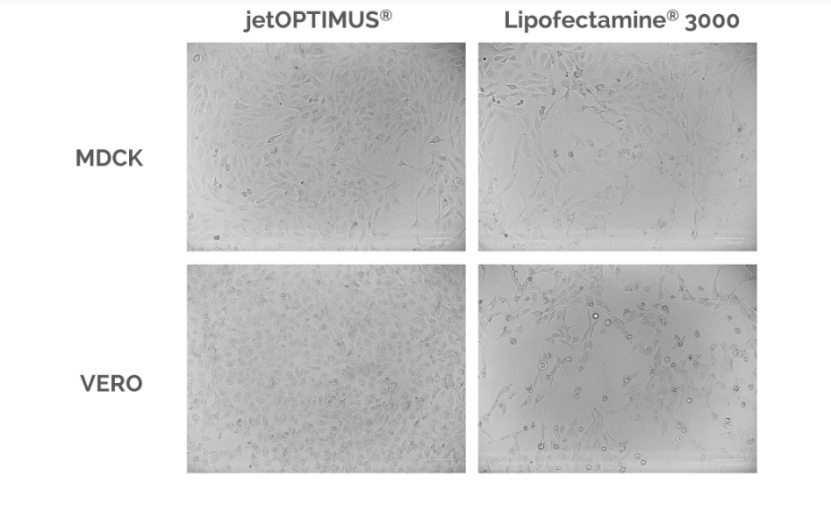 圖2:轉(zhuǎn)染后24小時,細胞保持健康并保持良好的形態(tài)。在用編碼GFP蛋白的質(zhì)粒轉(zhuǎn)染后24小時,根據(jù)制造商對每種試劑的建議,對MDCK和VERO細胞進行相差顯微鏡檢查。
