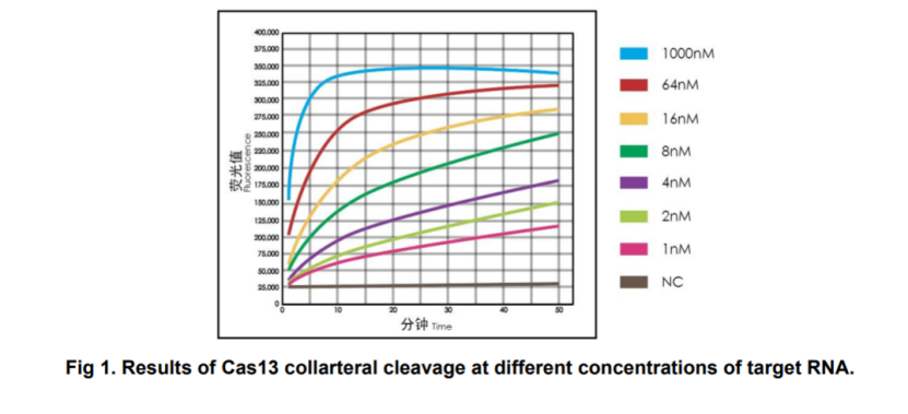 例:若某批次 LwaCas13a 酶的反式切割活性為 9.0 transU/pmol,則表明 1 pmol 的該批次 LwaCas13a酶可在 1 min 內,在上述指定的反應條件下,反式切割 9 pmol ssRNA 探針。本公司提供的 Cas 酶 transU數(shù)值詳見各批號的 COA 檢測報告。