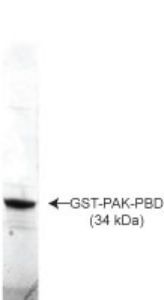 The Rac/Cdc42 (p21) binding domain (PBD) of the human p21 activated kinase 1 protein (PAK) protein has been expressed as a GST-fusion protein in E. coli. This protein binds binds specifically to GTP-bound, and not GDP-bound, Rac and Cdc42 proteins. The domain can therefore be used to specifically precipitate active, GTP-bound Rac and Cdc42 as well as to specifically block the activity of Rac and Cdc42 in vitro and in vivo.