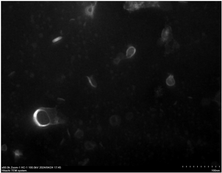 重懸外泌體至50-100 μL 2% PFA中,將5 μL混合懸液加到Formvar-carbon載樣銅網(wǎng)上;也可將5-10 μL混合懸液滴加到封口膜上,將銅網(wǎng)Formvar膜面朝下放在懸液上。每個樣品準備2-3個銅網(wǎng);將100 μL PBS加到封口膜上。用鑷子將銅網(wǎng) (Formvar膜面朝下) 放在PBS液滴上清洗(在所有步驟中,都應保持Formvar膜面濕潤,而另一面干燥);將銅網(wǎng)放在50 μL 1%戊二醛液滴上5 min;將銅網(wǎng)放在100 μL ddH2O洗滌8次,每次洗2 min;將銅網(wǎng)放在50 μL草酸雙氧鈾液滴上(pH 7.0),5 min;將銅網(wǎng)放在50甲基纖維素液滴上10 min,冰上操作;銅網(wǎng)放到樣品臺頂端的不銹鋼環(huán)上,用濾紙吸去多余液體;空氣中干燥5-10 min;將銅網(wǎng)放在樣品盒內(nèi),80 kV下拍攝電鏡照片。
