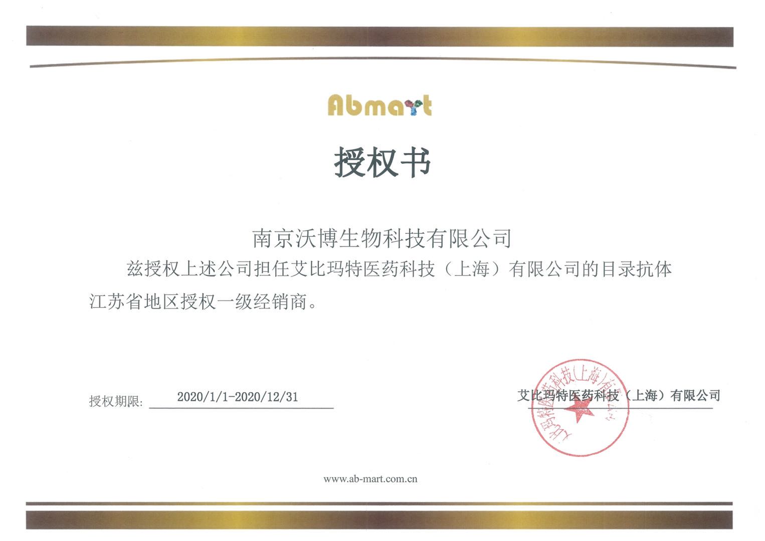祝賀南京沃博生物成為Abmart艾比瑪特醫(yī)藥科技(上海)有限公司2020年江蘇省授權(quán)代理商