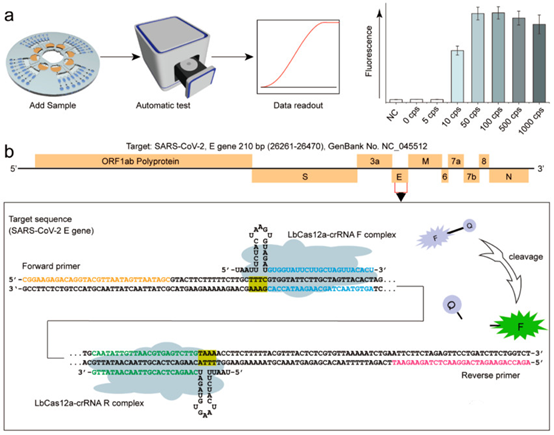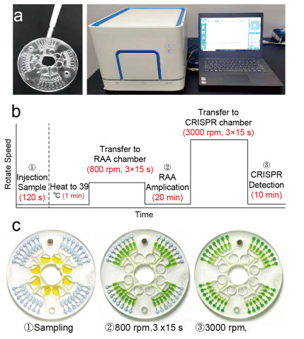 圖1 CRISPR/Cas12a輔助的RT-RAA的超敏檢測SARS-CoV-2的自動化離心微流控平臺
