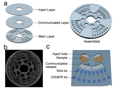 近期,南方科技大學(xué)的研究人員開發(fā)了一種雙CRISPR/Cas12a輔助的逆轉(zhuǎn)錄-重組酶介導(dǎo)擴增(RT-RAA)檢測方法和“樣本進-結(jié)果出”的離心微流控平臺,該平臺可在30min內(nèi)自動檢測1拷貝/μL的新冠病毒(SARS-CoV-2),具有一步、自動化、快速和靈敏的優(yōu)點,在臨床診斷和疾病預(yù)防方面具有重大潛力。相關(guān)研究成果以“Dual-CRISPR/Cas12a-Assisted RT-RAA for Ultrasensitive SARS-CoV?2 Detection on Automated Centrifugal Microfluidics”為題發(fā)表于Analytical Chemistry期刊。