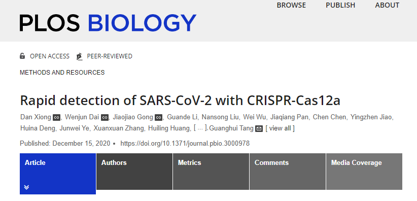 亞能生物湯光輝博士的課題組在《PLOS Biology》期刊上發(fā)表了題為“Rapid detection of SARS-CoV-2 with CRISPR-Cas12a.”的文章,影響因子9.593文中介紹了一種基于CRISPR Cas12a的檢測(cè)SARS-CoV-2的方法。