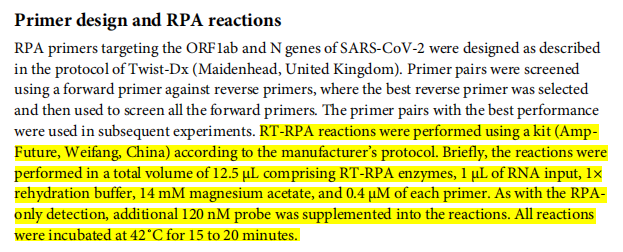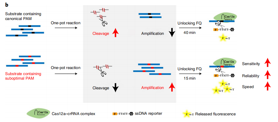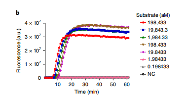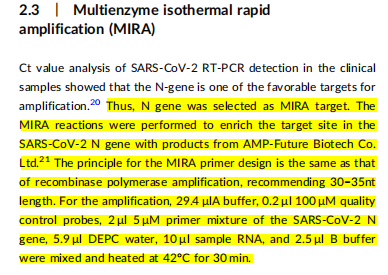 該實(shí)驗(yàn)將MIRA與CRISPR結(jié)合,提供了一個(gè)可視化檢測(cè)方法,且反應(yīng)溫度為37-42°C,控溫要求低,節(jié)省了昂貴儀器的成本,大大提高現(xiàn)場(chǎng)檢測(cè)的可能性。