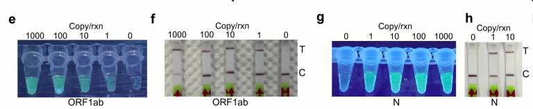 該實(shí)驗(yàn)的分析靈敏度為1拷貝/μL,即達(dá)到1拷貝/反應(yīng),且可以通過(guò)肉眼觀察結(jié)果。這種準(zhǔn)確、便攜、快速的檢測(cè)方法在非專業(yè)分子實(shí)驗(yàn)室環(huán)境中對(duì)檢測(cè)COVID-19方面具有巨大的市場(chǎng)前景及發(fā)展?jié)摿Α?/span>