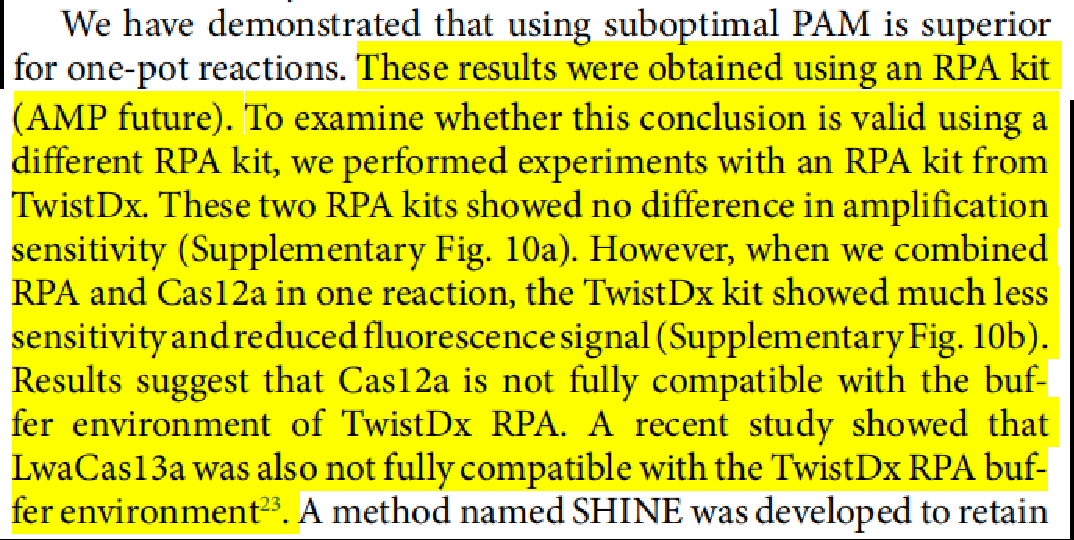 實(shí)驗(yàn)同步還使用了美國(guó)雅培的TwistDx恒溫?cái)U(kuò)增試劑做對(duì)比結(jié)果顯示,安普未來(lái)的MIRA試劑和雅培的靈敏度一致,檢測(cè)限為24拷貝/反應(yīng)。但雅培與Cas12a、Cas13a的緩沖環(huán)境并不完全兼容。安普未來(lái)的MIRA試劑在保證準(zhǔn)確性、靈敏度的同時(shí),穩(wěn)定性和兼容性更勝一籌!