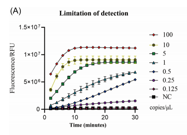 實(shí)驗(yàn)成功開(kāi)發(fā)了一種基于恒溫?cái)U(kuò)增(安普未來(lái)恒溫?cái)U(kuò)增試劑)和CRISPR相結(jié)合一步法熒光檢測(cè)(SARS-CoV-2)的方法,檢測(cè)時(shí)間小于20 分鐘,靈敏度與RT-qPCR一致且特異性強(qiáng)。該方法快速、靈敏和便于操作。