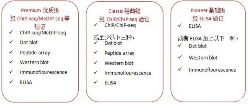 2004年以來,Diagenode就與領(lǐng)先的表觀遺傳學(xué)專家和表觀遺傳學(xué)聯(lián)盟合作生產(chǎn)、驗證包括抗體在內(nèi)的表觀遺傳學(xué)試劑。2012年,Diagenode用一種創(chuàng)新、嚴(yán)謹(jǐn)?shù)目贵w分類系統(tǒng)改革了免疫沉淀技術(shù),用于表觀遺傳學(xué)研究。根據(jù)驗證水平將抗體分為三個不同級別,以幫助您建立選擇抗體的信心。最終,用您信任的抗體獲得滿意的結(jié)果。