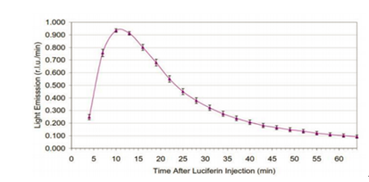 A:熒光素腹腔注射老鼠后約1 min后,能夠表達(dá)熒光素酶的細(xì)胞開始發(fā)光,10 min后強(qiáng)度達(dá)到穩(wěn)定的最高點(diǎn),在最高點(diǎn)持續(xù)約20-30 min后開始衰減,約3 h后熒光素排除,發(fā)光全部消失,最好的檢測時間是在注射后15-35 min內(nèi)。其動力學(xué)曲線如下圖: