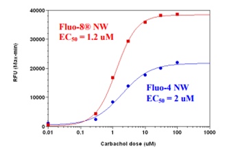 圖2.使用Screen Quest Fluo-8 NW測定試劑盒和Fluo-4 NWAssay試劑盒在HEK-293細(xì)胞中測量卡巴膽堿劑量反應(yīng)。將HEK-293細(xì)胞以40,000個細(xì)胞/100μL/孔接種過夜,置于96孔黑色壁/透明底板中。除去生長培養(yǎng)基,將細(xì)胞分別與100μL的Screen Quest一起孵育 ] Fluo 8-NWcalcium測定試劑盒和Fluo-4 NW試劑盒(根據(jù)制造商的說明書)在室溫下保持1小時。通過NOVOstar(BMG LabTech)添加卡巴膽堿(25μL/孔)以達(dá)到最終指示的濃度。 Fluo-8NW的EC50約為1.2 uM。