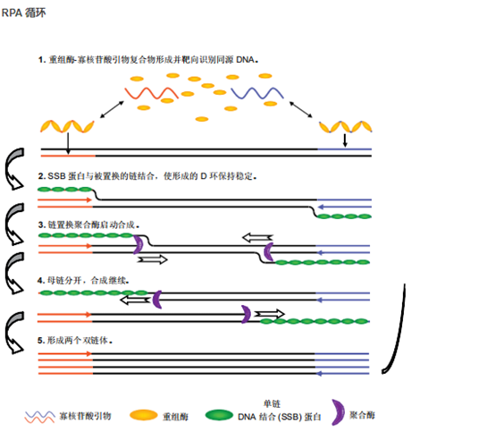 重組酶與引物結(jié)合形成的蛋白-DNA復(fù)合物,能在雙鏈DNA中尋找同源序列。一旦引物定位了同源序列,就會發(fā)生鏈交換反應(yīng)形成并啟動DNA合成,對模板上的目標(biāo)區(qū)域進(jìn)行指數(shù)式擴(kuò)增。被替換的DNA鏈與SSB結(jié)合,防止進(jìn)一步替換。在這個體系中,由兩個相對的引物起始一個合成事件。整個過程進(jìn)行得非??欤话憧稍谑昼娭畠?nèi)獲得可檢出水平的擴(kuò)增產(chǎn)物。