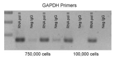 用1%的甲醛固定Hela細胞10分鐘,使用超聲法破碎染色質(zhì),使用陰性對照IgG和RNA pol II抗體,對不同細胞數(shù)量來源(100,000到750,000個細胞)的染色質(zhì)進行ChIP,重復(fù)2次。使用陽性對照引物GAPDH對ChIP后的DNA進行36個循環(huán)的PCR分析(抗體和引物包含在人ChIP-IT對照試劑盒里,Active motif也可以提供小鼠和大鼠對照試劑盒)。取10ul PCR產(chǎn)物進行1%凝膠電泳,EB染色后紫外觀察。結(jié)果顯示與使用陰性對照IgG相比,使用RNA pol II抗體的ChIP大量富集了GAPDH啟動子區(qū)域的DNA序列。