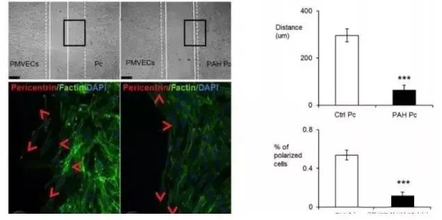 由圖可見,相對(duì)于左側(cè)的對(duì)照,右邊的PAH來源的Pericytes遷移距離較短,并且從熒光標(biāo)記圖上可見,紅色箭頭表示遷移的方向,PAH組無特定方向,不受PMVEC的影響。柱狀圖為統(tǒng)計(jì)結(jié)果。