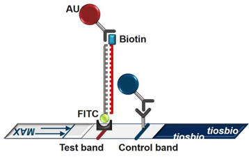 沃博生物的核酸試紙的原理也是非常類似的,但是親和素用來(lái)偶聯(lián)了金顆粒,抗FITC抗體用來(lái)包被了T線。同時(shí)采用紅色膠體金顆粒對(duì)應(yīng)T線和藍(lán)色乳膠顆粒對(duì)應(yīng)C線。