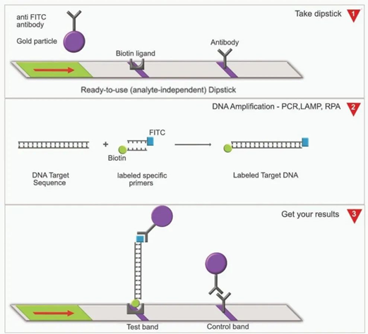 這個核酸試紙利用分子技術(shù)做擴(kuò)增,將biotin FITC連接到DNA上,利用免疫層析,夾心法檢測兩頭帶有biotin/FITCDNA