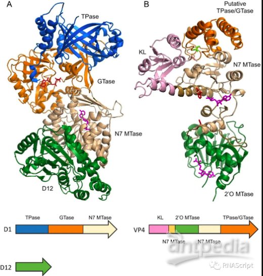 一些病毒加帽酶整合了RNA加帽所有必要酶活性(多功能加帽酶),以在單個多肽中生成Cap0或Cap1。痘病毒加帽酶和藍(lán)舌病病毒加帽酶就是這樣兩個例子,它們的全長蛋白質(zhì)結(jié)構(gòu)已經(jīng)被解析(圖4):