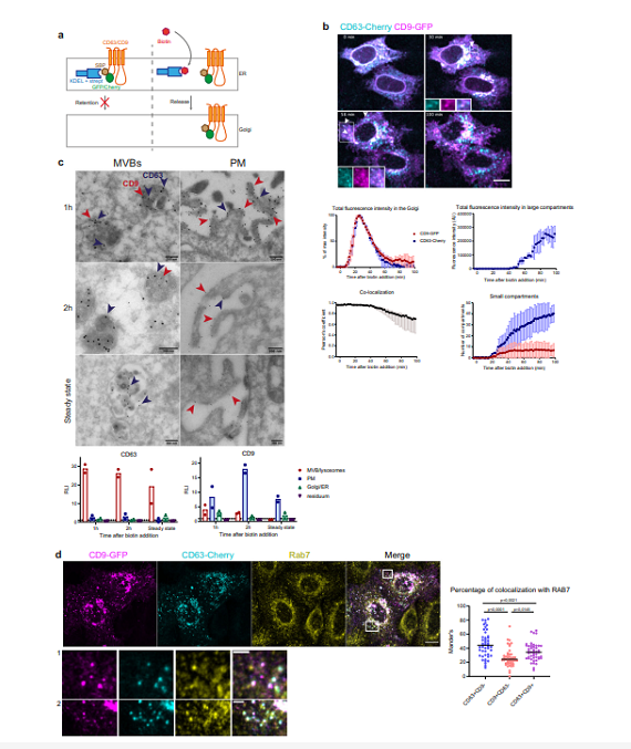 pHluorin在酸性條件下實(shí)際上是無(wú)熒光的,但在中性pH時(shí)發(fā)出熒光,因此使其成為觀察酸性晚期胞內(nèi)MVB與質(zhì)膜融合的理想報(bào)告分子。由于細(xì)胞外部環(huán)境處于中性pH,因此在融合過(guò)程中會(huì)發(fā)生酸到中性的轉(zhuǎn)換。免疫電鏡表明在所有時(shí)間點(diǎn),大多數(shù) MVB 和溶酶體僅包含 CD63 而不是 CD9。