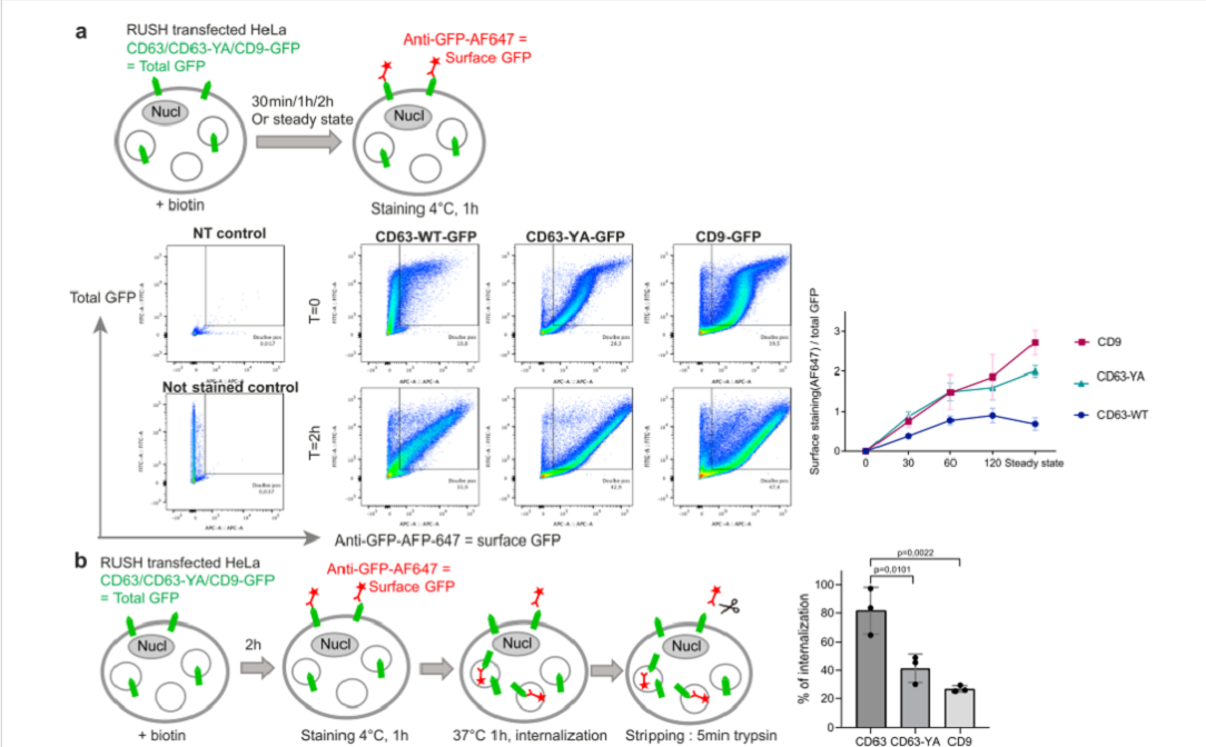 溶酶體靶向基序進(jìn)行突變?yōu)镃D63-YA,CD63 - WT - eGFP或CD63 - YA - eGFP RUSH 質(zhì)粒轉(zhuǎn)染的 HeLa 細(xì)胞;結(jié)果顯示,在穩(wěn)定狀態(tài)下,與 CD63-WT 相反,CD63-YA 主要位于細(xì)胞外圍和一些小的細(xì)胞內(nèi)區(qū)室中。動(dòng)力監(jiān)測(cè)結(jié)果顯示,突變體 CD63-YA 不會(huì)進(jìn)入酸性?xún)?nèi)部隔間;同時(shí),用生物素處理后,結(jié)果顯示CD9 和 CD63-YA 在添加生物素后約 1 小時(shí)達(dá)到相似的表面 (AF647)/總 (GFP) 熒光強(qiáng)度比為 1,在穩(wěn)態(tài)下進(jìn)一步增加至約 2;相比之下,對(duì)于 CD63,最大表面/總比值增加但保持低于 1,直到添加生物素后 2 小時(shí),并在 2 小時(shí)和穩(wěn)態(tài)之間下降,CD63-YA 和 CD9 表現(xiàn)相似并在質(zhì)膜上積累。