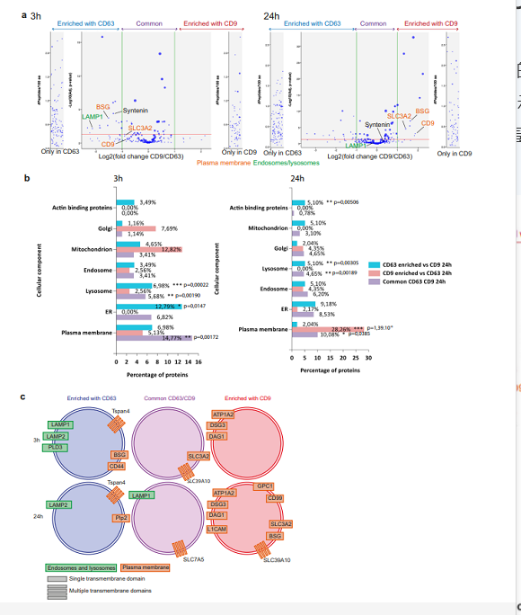 為了更好地確定CD63 +和CD9 + EV的起源,并鑒定PM或內(nèi)體釋放的EV的特定標(biāo)志物,研究者進(jìn)行了定量質(zhì)譜分析;同步分泌的 CD63 或 CD9 EV 的定量質(zhì)譜分析揭示了質(zhì)膜和內(nèi)體衍生的 EV 的特征,PM 蛋白在 CD9-EV 中富集,而內(nèi)體/溶酶體和 PM 跨膜蛋白都在 CD63-EV 中富集。