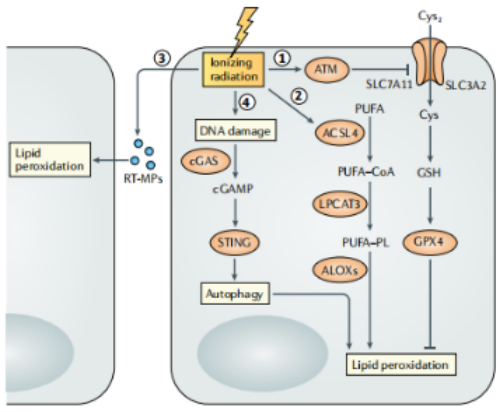 放療可通過多種機制引起癌細(xì)胞的鐵死亡。抑制SLC7A11激活A(yù)CSL4的表達(dá),從而促進PUFAs插入到膜磷脂中,形成含多不飽和脂肪酸的磷脂(PUFA-PLs),用于隨后的脂氧合酶介導(dǎo)的氧化。受輻射的腫瘤細(xì)胞釋放的微粒(RT-MPs)主要通過鐵死亡來產(chǎn)生,這種微??烧T導(dǎo)旁效應(yīng)。環(huán)狀GMP-AMP合成酶(cGAS)的激活信號誘導(dǎo)自噬依賴的鐵死亡。