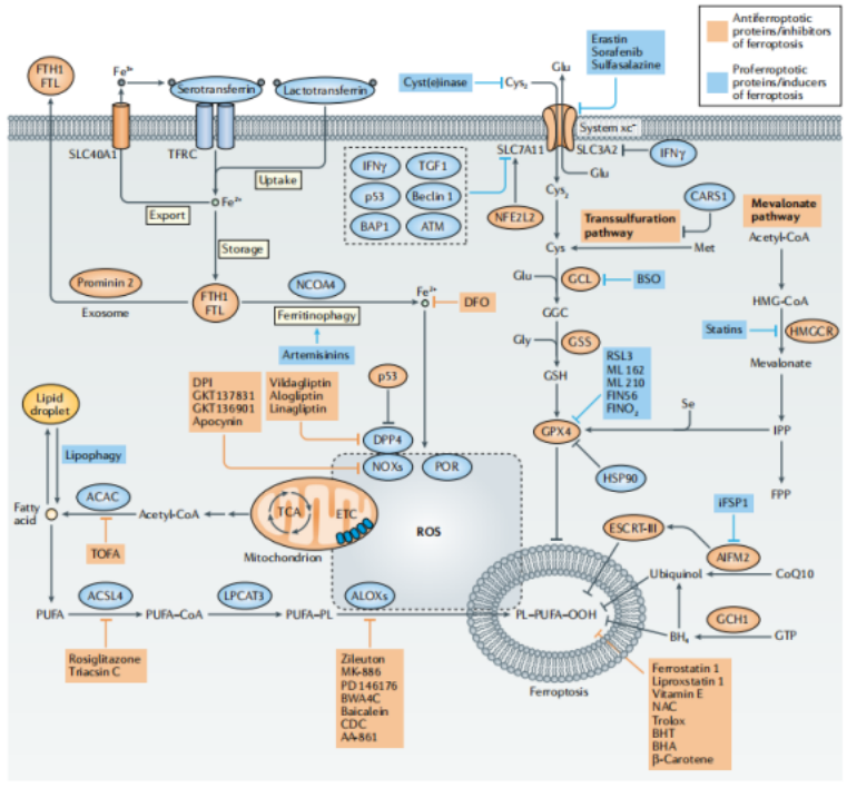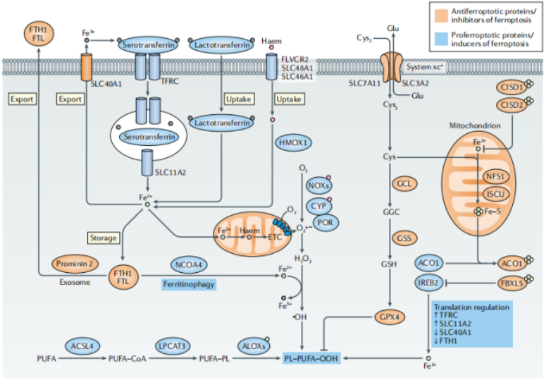 載鐵的血清轉(zhuǎn)鐵蛋白-轉(zhuǎn)鐵蛋白受體(TFRC)復(fù)合物通過核內(nèi)體內(nèi)化,通過自然抗性相關(guān)巨噬細(xì)胞蛋白(SLC11A2)釋放鐵(Fe2+)到細(xì)胞質(zhì)中。乳轉(zhuǎn)鐵蛋白和血紅素通過細(xì)胞膜中不同的攝取途徑提供額外的鐵來源。Fe2+主要通過細(xì)胞膜上的溶質(zhì)載體家族(SLC40A1)輸出,但也可以通過外泌體作為鐵蛋白輸出。鐵死亡在翻譯水平上受鐵調(diào)節(jié)蛋白(IRPs) ACO1和IREB2的調(diào)控。
