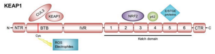 KEAP1由一個N端結(jié)構(gòu)域(NTR)、一個Broad-Complex、軌道、bric-à-brac (BTB)結(jié)構(gòu)域、一個干預(yù)區(qū)(IVR)和六個與C端結(jié)構(gòu)域(CTR)結(jié)合的Kelch結(jié)構(gòu)域組成,這些結(jié)構(gòu)域與NRF2、p62和其他E/ STGE蛋白相互作用。BTB結(jié)構(gòu)域?qū)τ贙EAP1二聚和與CUL3的相互作用非常重要,它包含一個半胱氨酸殘基(C151),可以感知活性氧(ROS)和親電試劑。位于其他KEAP1結(jié)構(gòu)域的其他半胱氨酸殘基對其他刺激有響應(yīng)(未顯示)。