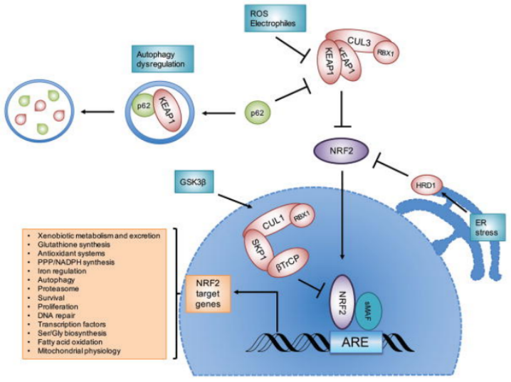 NRF2受E3泛素連接酶復(fù)合物的負(fù)調(diào)控:KEAP1-CUL3-RBX1復(fù)合物、β-TrCP-SKP1-CUL1-RBX1復(fù)合物和HRD1。當(dāng)NRF2蛋白在暴露于活性氧(ROS)、親電試劑或自噬異常調(diào)節(jié)后而升高時,NRF2會轉(zhuǎn)位到細(xì)胞核,與sMAF蛋白二聚,并與抗氧化反應(yīng)元件(ARE)結(jié)合,激活其靶基因的轉(zhuǎn)錄。圖6指出了NRF2靶基因調(diào)控的一般過程的例子。