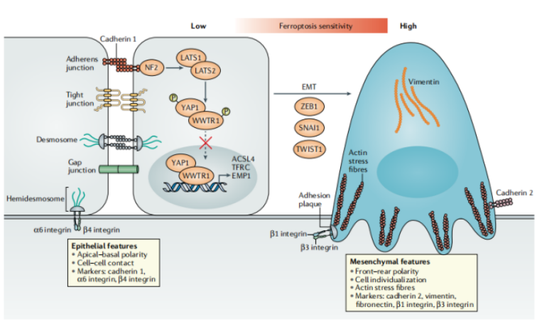 在上皮細(xì)胞中,細(xì)胞-細(xì)胞接觸抑制鐵死亡,部分是通過鈣粘蛋白1介導(dǎo)的抑制YAP1轉(zhuǎn)錄活性。相比之下,間充質(zhì)狀態(tài)的細(xì)胞由于細(xì)胞-細(xì)胞接觸的缺失和參與上皮-間充質(zhì)轉(zhuǎn)化(EMT)的因子的激活,如ZEB1、SNAI1和TWIST1,容易發(fā)生鐵死亡。