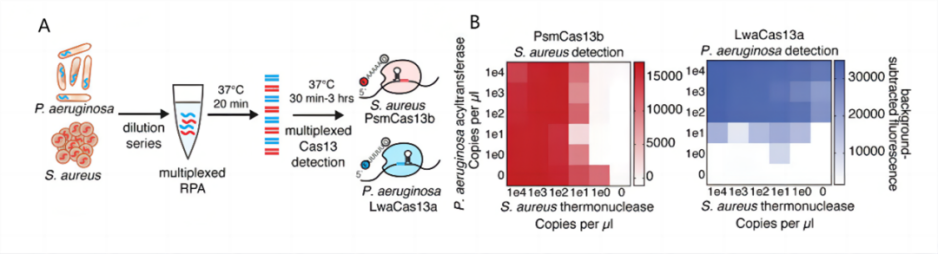 Gootenberg[8]等基于重組酶聚合酶擴增技術(shù) (Recombinase Polymerase Amplification, RPA)和CRISPR/Cas13建立了RPA-CRISPR/Cas-雙重熒光檢測系統(tǒng)。通過多重RPA擴增,再將擴增產(chǎn)物轉(zhuǎn)錄得到RNA靶標,兩種不同的RNA靶標分別與Cas13a/crRNA、Cas13b/crRNA結(jié)合并激活對應Cas13蛋白的反式剪切活性。根據(jù)Cas13蛋白反式剪切探針的偏好性,采取Cas13a剪切poly U探針,Cas13b剪切poly A探針,兩種探針分別標記不同的熒光基團,從而通過檢測兩種熒光信號強度的變化,實現(xiàn)對金黃色葡萄球菌和銅綠假單胞菌的同時檢測。