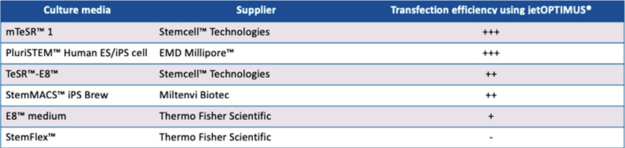 表1A:jetOPTIMUS?在用幾種商業(yè)干細(xì)胞培養(yǎng)基培養(yǎng)的hiPSC中的轉(zhuǎn)染效率從最高到最低。