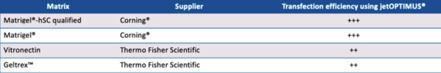 表1B:jetOPTIMUS?在用幾種商業(yè)干細(xì)胞基質(zhì)培養(yǎng)的hiPSC中的轉(zhuǎn)染效率從最高到最低。