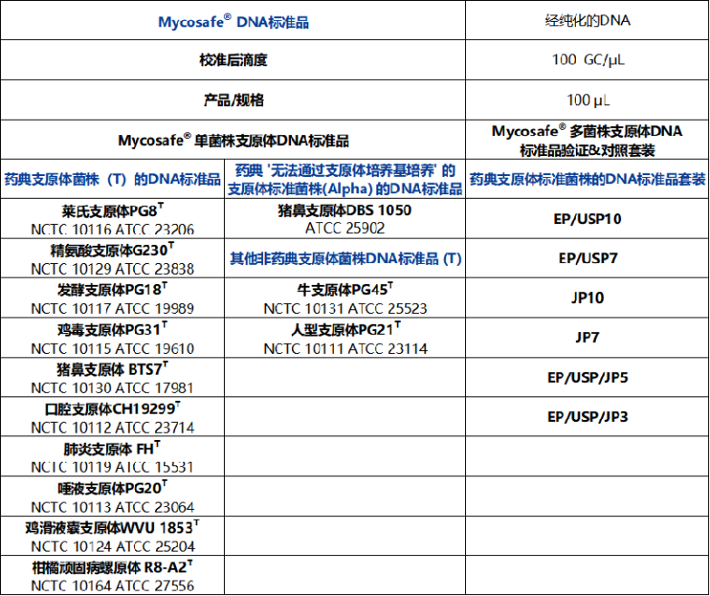 Mycosafe滅活支原體培養(yǎng)標(biāo)準(zhǔn)品經(jīng)專門開發(fā),特別適合用于:?。┰谏逃没蚍巧逃弥гw實時PCR檢測系統(tǒng)(包括培養(yǎng)基富集法/實時PCR雜交)的通用和特定產(chǎn)品驗證中用作標(biāo)準(zhǔn)品;(ⅱ)與傳統(tǒng)的基于培養(yǎng)法的支原體檢測方法進(jìn)行比較;(ⅲ)作為常規(guī)支原體檢測的對照品。 確認(rèn)與法規(guī)及產(chǎn)品相關(guān)的全部支原體,以確保產(chǎn)品安全Mycosafe? 可提供17種藥典支原體標(biāo)準(zhǔn)菌株和4種與產(chǎn)品相關(guān)的非藥典支原體菌株,它們可代表大多數(shù)在傳統(tǒng)生物制藥和先進(jìn)治療藥物(ATMP)中的基因療法及再生醫(yī)學(xué)中被視為污染物的支原體,其中包含:? 藥典 EP第2.6.7章、USP第<63>章和JP第17版第G3章中所列出的所有10種支原體菌株。? 根據(jù)EP、USP和JP支原體測試指南,豬鼻支原體(Mycoplasma hyorhinis)α標(biāo)準(zhǔn)菌株DBS 1050,是生物制藥原料進(jìn)行傳統(tǒng)細(xì)胞系培養(yǎng)法所需的供試菌。? 由于該菌株無法在標(biāo)準(zhǔn)支原體培養(yǎng)基中培養(yǎng),因此該重要的菌株標(biāo)準(zhǔn)品無法通過其他方式獲得。? EP第2.6.7章中列出的所有5種EDQM支原體野外分離株。? 符合EP和USP的支原體野外分離株要求的肺炎支原體(Mycoplasma bovis)5167(與Mycoplasma Experience Ltd公司合作提供)。? 如使用牛血清作為生長培養(yǎng)基補充物,則對需牛支原體型菌株P(guān)G45T進(jìn)行檢測。? 對于血液來源和基于胎盤細(xì)胞的前沿治療藥物,需要使用人型支原體菌株P(guān)G21T和解脲支原體菌株T960T作為供試菌。? 如果生產(chǎn)過程中使用鼠類細(xì)胞系,則推薦使用關(guān)節(jié)炎型支原體菌株P(guān)G6T作為供試菌。 使用科學(xué)準(zhǔn)確且符合法規(guī)要求的支原體標(biāo)準(zhǔn)品進(jìn)行PCR實時檢測,以驗證方法的適用性和可比性基因拷貝數(shù)(GC)和菌落形成單位(CFU)的相關(guān)性符合法規(guī)要求,每批次的Mycosafe標(biāo)準(zhǔn)品的GC / CFU比值低至1~5。