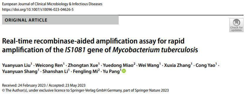 首都醫(yī)科大學附屬北京胸科醫(yī)院副書記龐宇老師課題組在《European Journal of Clinical Microbiology & Infectious Diseases 》期刊上發(fā)表文章《Real-time recombinase-aided amplifcation assay for rapid amplifcation of the IS1081 gene of Mycobacterium tuberculosis》,影響因子4.5。