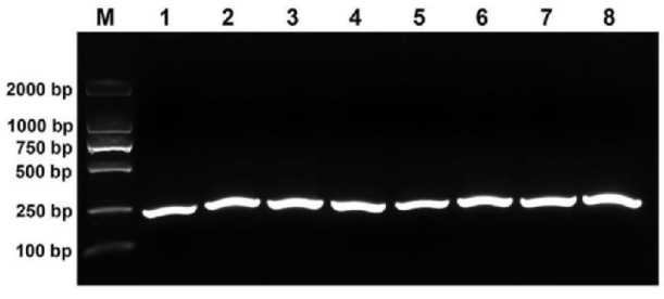 對(duì)于水稻干尖線蟲(chóng)的核酸提取,作者采用的是改進(jìn)的貝爾曼漏斗法。而后對(duì)提取的核酸進(jìn)行RPA擴(kuò)增。為達(dá)到檢測(cè)性能最佳,首先對(duì)RPA引物進(jìn)行評(píng)估,在25°C、28°C、32°C、35°C、37°C、39°C、42°C和45°C不同溫度下對(duì)含有線蟲(chóng)目標(biāo)片段的重組質(zhì)粒進(jìn)行擴(kuò)增,所有溫度下均能擴(kuò)增,但為了方便實(shí)驗(yàn)操作和對(duì)降低設(shè)備的要求,后續(xù)RPA反應(yīng)選擇37°C,該溫度也有利于Cas12a活性的發(fā)揮(圖2)。