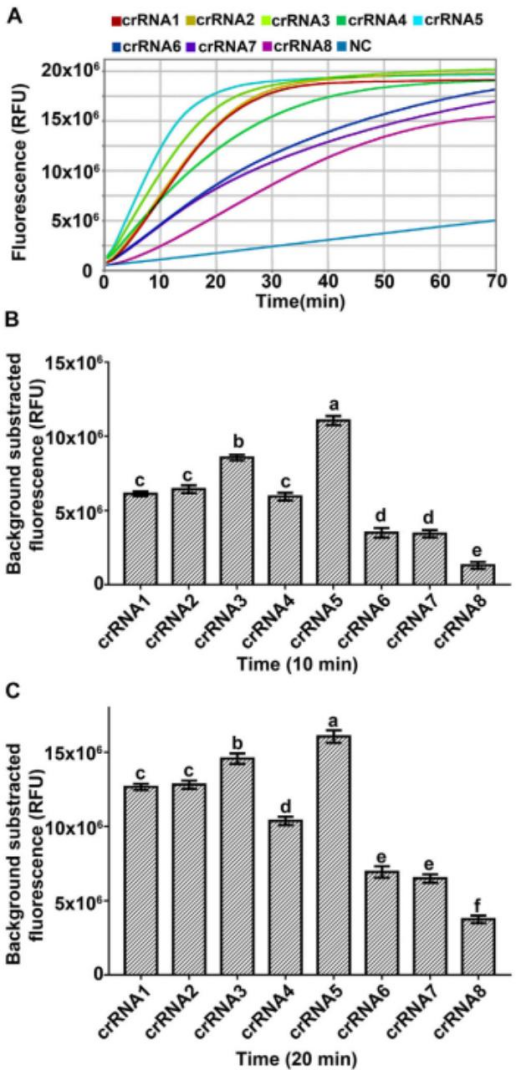 緊接著,作者選用ToloBio提供的的LbCas12a(#32108-03,Tolo Biotech, Anhui, China),利用該酶的反式切割活性建立了CRISPR檢測(cè)體系。crRNA是影響Cas12a反式切割活性的主要因素,所以作者針對(duì)水稻干尖線蟲(chóng)目標(biāo)片段設(shè)計(jì)了8條crRNA進(jìn)行crRNA的篩選,最終選擇高活性的crRNA5用于后續(xù)檢測(cè),該crRNA5可在20分鐘時(shí)間內(nèi)獲得理想的結(jié)果(圖3)。