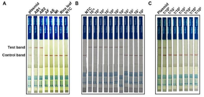 為便于現(xiàn)場(chǎng)檢測(cè)及方便用戶,作者將RPA-Cas12a與LFA技術(shù)相結(jié)合,建立了RPA-Cas12a-Ab-LFA檢測(cè)方案。同樣地,作者對(duì)此簡(jiǎn)易化檢測(cè)系統(tǒng)進(jìn)行了特異性和靈敏度的驗(yàn)證。水稻干尖線蟲(chóng)樣品(AB1和AB2)顯示出與陽(yáng)性對(duì)照相似的清晰條帶,非水稻干尖線蟲(chóng)樣品(AF,AS和MI)未觀察到交叉反應(yīng),這也證明了RPA-Cas12a-Ab-LFA檢測(cè)體系的特異性。使用含有水稻干尖線蟲(chóng)目標(biāo)片段的重組質(zhì)粒pUC57-18S和提取的水稻干尖線蟲(chóng)的基因組DNA進(jìn)行10倍梯度稀液后測(cè)試靈敏度,結(jié)果表明,該系統(tǒng)可檢測(cè)到1000 copies/μL的含目標(biāo)片段質(zhì)粒樣本,或是10-1稀釋的水稻干尖線蟲(chóng)基因組DNA提取樣本(圖6)。