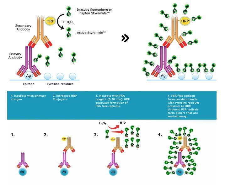 3.PSA 自由基的更高反應(yīng)性允許在HRP-靶相互作用位點(diǎn)更快速,有效和更穩(wěn)定記Styramide綴合物。