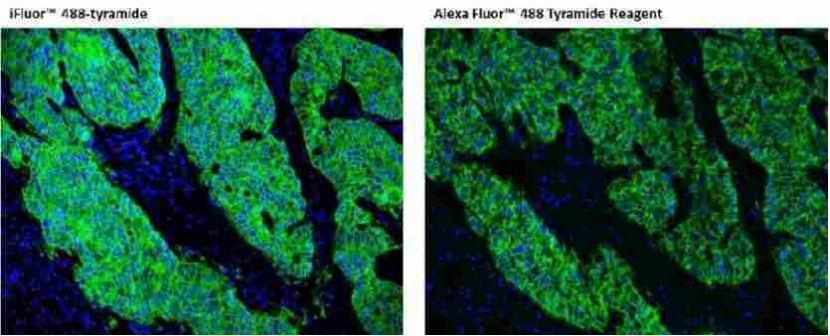 圖2.分別用iFluor 488 PSA和Alexa Fluor 488 TSA染色甲醛固定的石蠟包埋人肺腺癌陽性組織的染色結(jié)果圖。人肺腺癌陽性組織切片用兔抗EpCam抗體染色,然后用polyHRP標(biāo)記的山羊抗兔IgG二抗孵育,后使用iFluor 488 PSA (Cat#45020)和Alexa Fluor 488 TSA分別染色。圖像顯示iFluor 488 PSA與Alexa Fluor 488 TSA相比提高了熒光IHC的靈敏度。