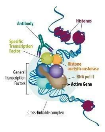 在活細(xì)胞狀態(tài)下,當(dāng)用甲醛處理時,相互靠近的蛋白與蛋白、蛋白與核酸(DNARNA)之間會產(chǎn)生共價鍵。細(xì)胞內(nèi),當(dāng)TFPromoter相互結(jié)合時,它們必然靠的比較近或者契合在一起,這個時候用甲醛處理,能使它們之間產(chǎn)生共價鍵。固定的蛋白質(zhì)-DNA復(fù)合物通過超聲或酶處理將其隨機切斷為一定長度范圍內(nèi)的染色質(zhì)小片段,然后通過抗原抗體的特異性識別反應(yīng)沉淀此復(fù)合體,特異性地富集目的蛋白結(jié)合的DNA片段,通過對目的片斷的純化與檢測,從而獲得蛋白質(zhì)與DNA相互作用的信息。通過qPCR或二代測序,篩選與目的蛋白互作的未知DNA信息。