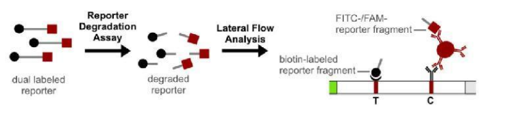 圖3. 報告基因的檢測原理。雙標記報告基因在檢測反應(yīng)中被降解。降解程度的增加與c線強度的增加相關(guān)。