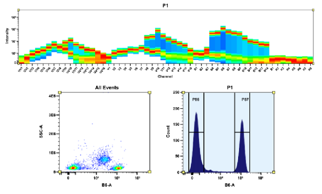 圖3.頂部)使用4激光光譜流式細(xì)胞儀生成光譜圖。使用空間偏移激光器(355 nm、405 nm、488 nm 和 640 nm)創(chuàng)建四個(gè)不同的發(fā)射曲線,然后組合起來產(chǎn)生整體光譜特征。
