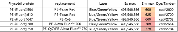 表3.AAT獨(dú)有的PE-iFluor系列串聯(lián)染料可以完美替代PE-Cy5,PE-Cy7,PE-AF 700,PE-Texas Red