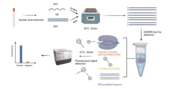 急性呼吸道感染是兒童常見的呼吸道疾病,通常由病毒引起。呼吸道合胞病毒(RSV)和呼吸道腺病毒(ADV)是引起兒童急性呼吸道感染的兩種常見病原體。輕度者可引起常見的感冒癥狀,如咳嗽和流鼻涕,而嚴(yán)重者可出現(xiàn)嚴(yán)重的并發(fā)癥,如肺炎和中耳炎。根據(jù)世界衛(wèi)生組織的建議,病原體的檢測(cè)需要具備快速、準(zhǔn)確、敏感、特異性的特點(diǎn),不應(yīng)依賴專門的技術(shù)人員或大型儀器。因此,開發(fā)一種能夠滿足上述檢測(cè)要求的RSV和ADV的檢測(cè)方法尤為重要。深圳兒童醫(yī)院兒科研究所的馬東禮主任課題組在《Scientific Reports》期刊上發(fā)表文章《A multiplex recombinase polymerase amplification assay combined with CRISPR/ Cas12a for the detection of respiratory syncytial virus and respiratory adenovirus》,影響因子4.6。